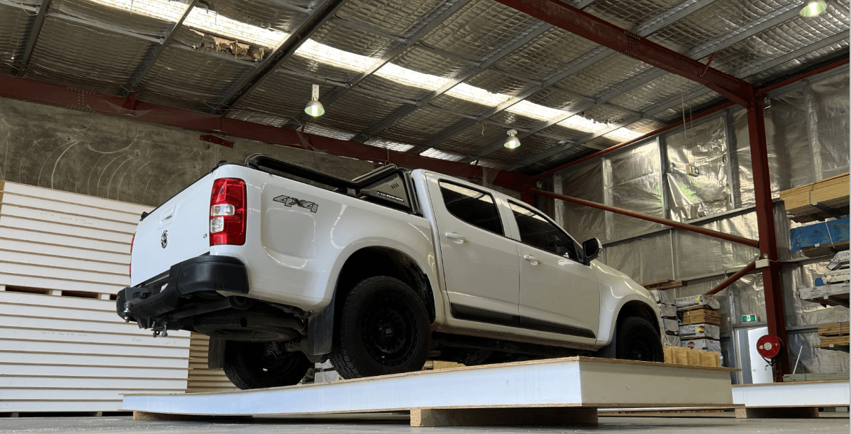 Just to prove how strong our panels are we elevated two 6 meter SIPS panels and drove a 1868kg Holden Colorado into the middle of them. As you can see, there is very little flex/bow in the panels.